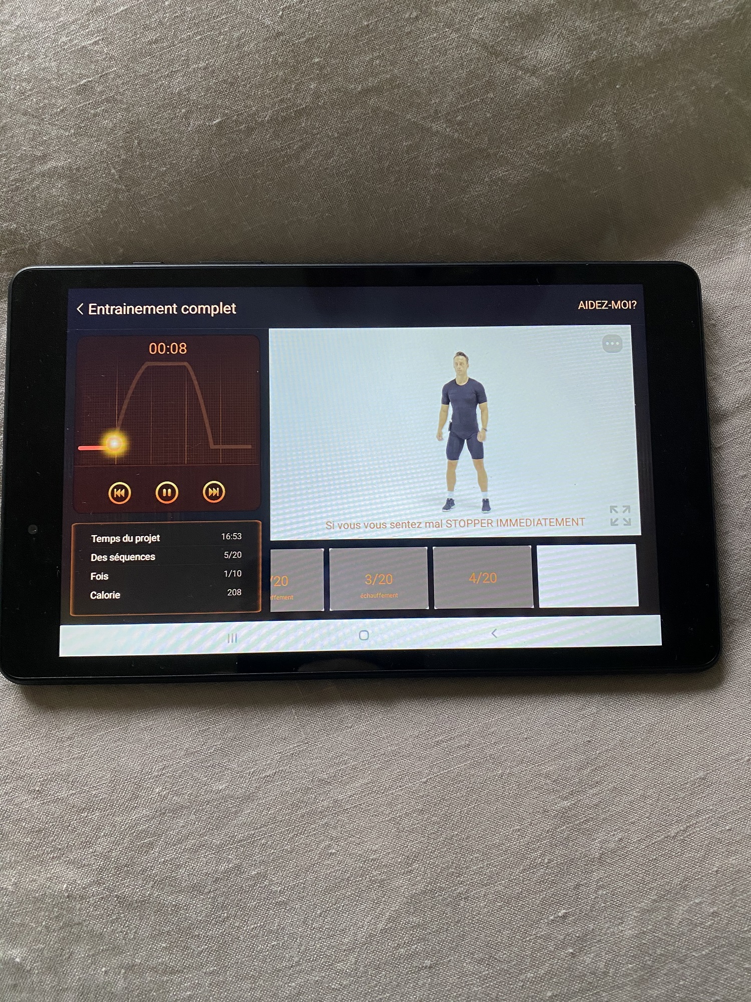 Cette combinaison donne la possibilité, via un mode spécifique qui envoie un flux continu, de ce coupler avec un footing de 30 min. J’ai testé à deux reprises ce mode mais j’ai pas ressenti un effet de fatigue musculaire supplémentaire contrairement aux différents tests en mode « Exercice ». Il est probable que j’ai pas mis une intensité aussi importante que dans l’autre mode. Cela dit, il est compliquer d’ajuster lors que la sortie a débuté, à moins de courir avec la tablette.